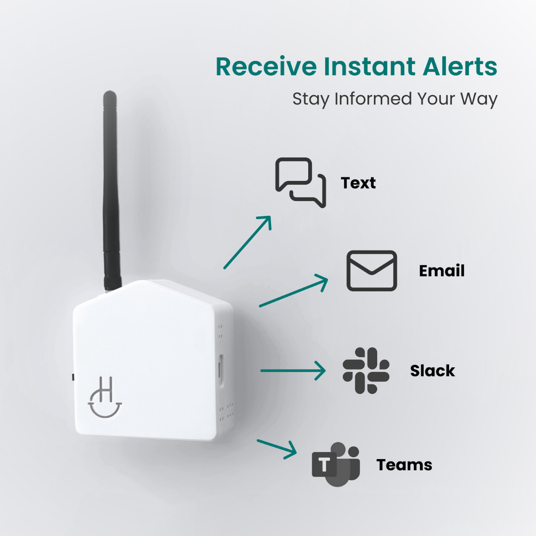 Set your own thresholds for temperature and humidity and receive immediate alerts via SMS, email, Slack, or Microsoft Teams. Notify up to 5 users so the right people are always in the loop.